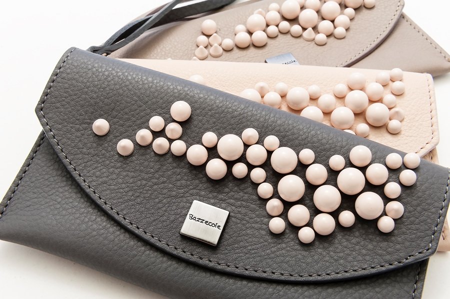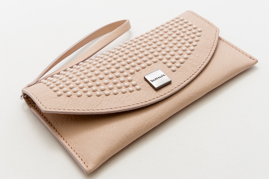 Pochette en cuir pour smartphone ESOTICA L Bazzecole produite en vraie cuir avec anse assortie et trois fleurs décoratives en contraste. La version de notre pochette pour smartphone avec display supérieur à 5".