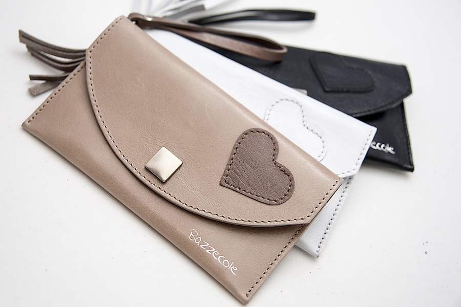 Pochette en cuir POLINESIA XL Bazzecole pour smartphone avec display supérieur aux 5” . La pochette, décorée avec un cœur cousu sur le devant, est réalisée en vraie cuir avec anse et pompon.
